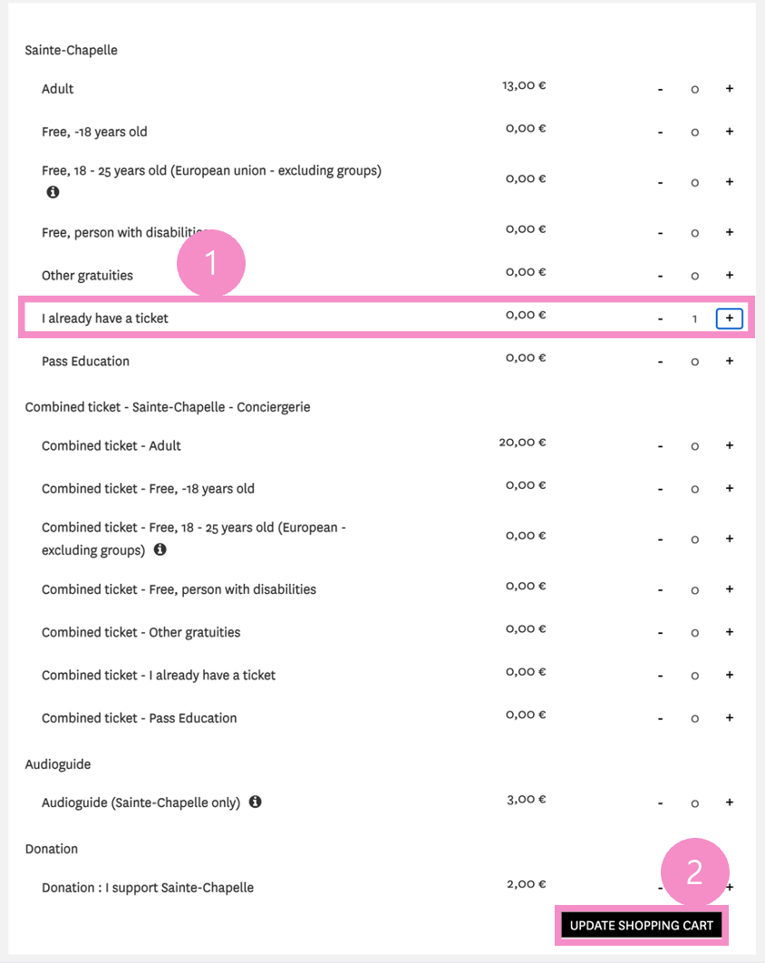 6. 뮤지엄 패스가 있다면 I already have a ticket의 수량 선택 > UPDATE SHOPPING CART 클릭
